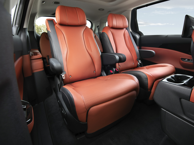 New for 2023, the Carnival offers unique very-important-person VIP lounge seats. These center-row captain’s chairs have special wing-out headrests. These power-adjustable seats also have leg extensions for extra comfort.