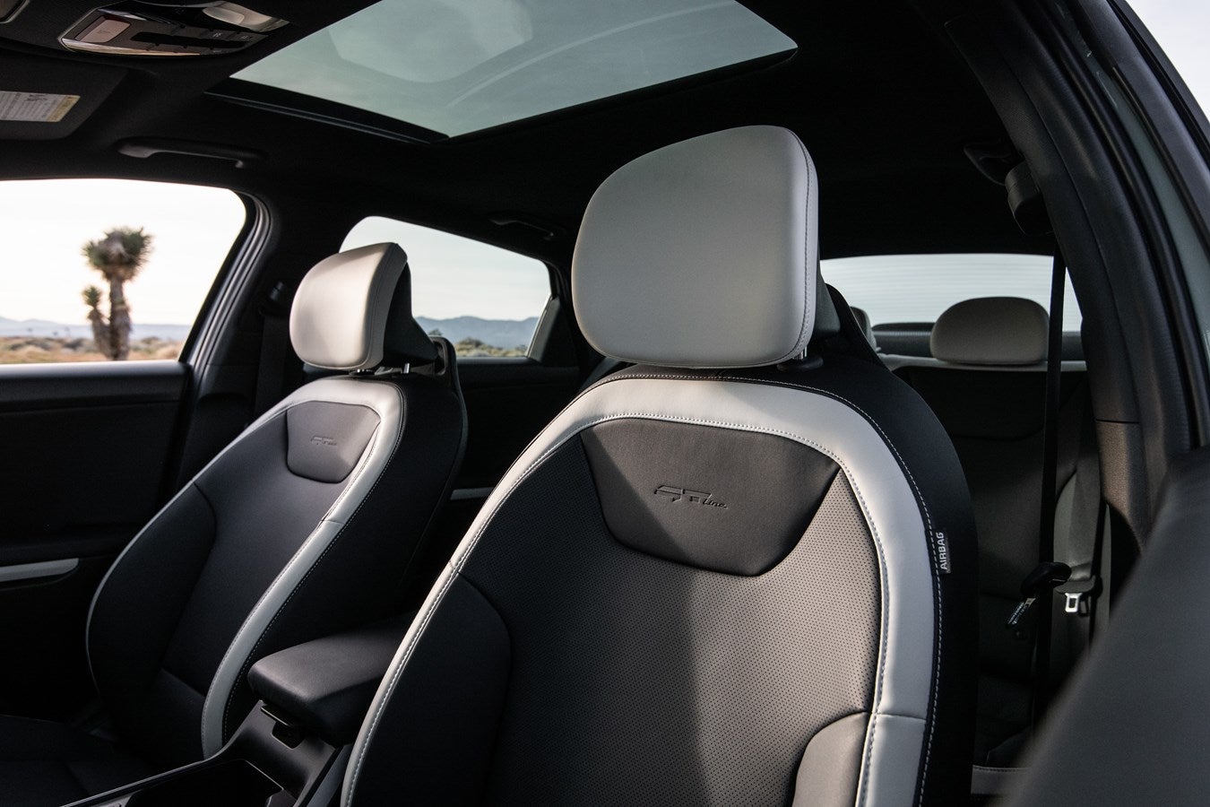 GT-Line interiors can wear a combination of Onyx and Off-White. Heated seats are standard, and ventilated seats are available. A special three-spoke steering wheel is among its sporty upgrades. If you choose the GT-Line turbo, Kia adds sport pedals to add to its driving fun.